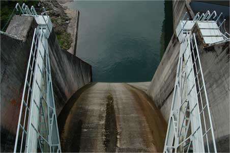 3門あるラジアルゲートの真ん中から下流を見下ろしたところ。