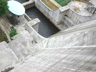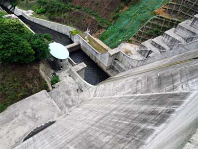 この辺りから堤体を見上げたらコンクリーの色んな形が連なって綺麗だろうに。