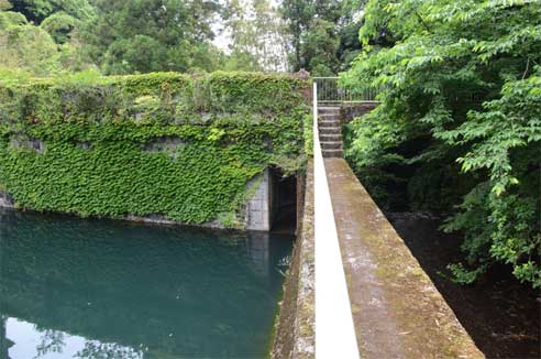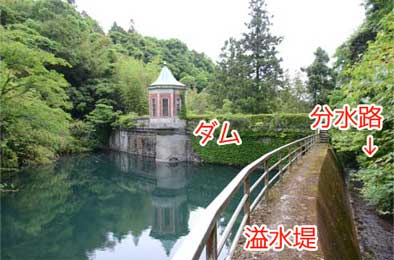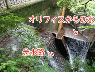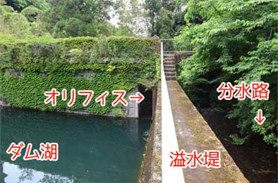 貯水池は満水になれば余剰分はオリフィスから溢水路(余水吐)へ