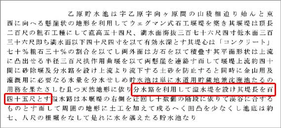「この分水路と貯水池の間の溢水堤は天端より低いですから