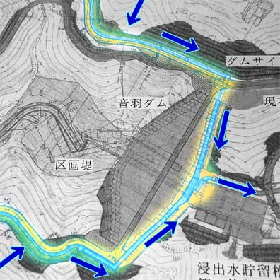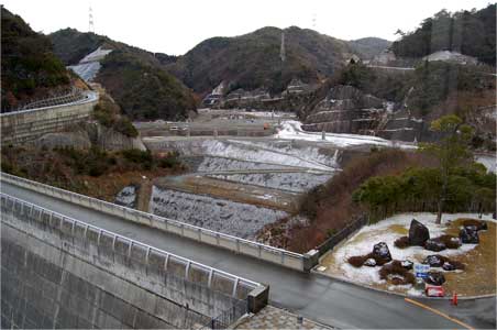 音羽ダムの両サイドからフーチングの横を階段状に降りてくる水路があります。