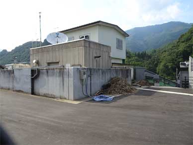 取水口のすぐ隣にある管理所を囲う防護壁に注目。