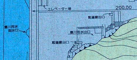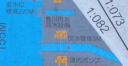 エレベーター棟横の説明板の平面図で描かれていた豊川用水取水口の位置。