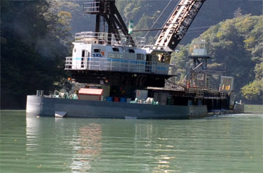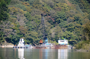 バケットを下ろして湖底の砂をつかんで引き上げる時にこんなに船が傾くんです。