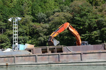 バックホウを乗せた浚渫船です。