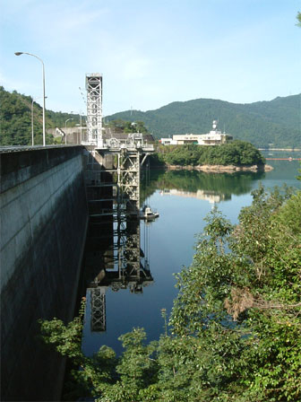 そして鏡のようなダム湖。 ゲートだけでなく管理所まで水鏡にこんなに綺麗に映っているなんて! やっぱり晴れた日の朝ダムは最高ですね。