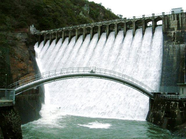 下流側にかかる橋は堤体左岸から宝塚方面に続く