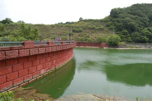 A :重力式ですが下流面に工事の残土を盛りたてて木を植えているので堤体が見えなくなっています。