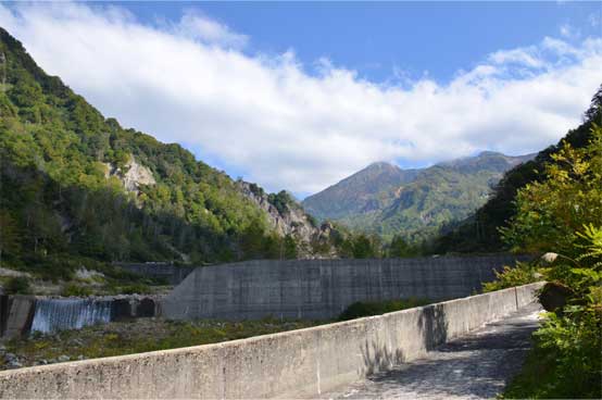 白岩堰堤を見上げるとタイミングよく勇気づけるように日差しが。