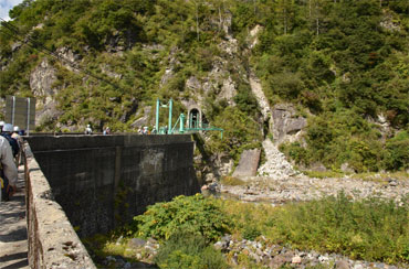1グループが堰堤の上の管理橋に進んでいます。