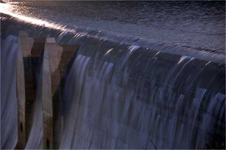 ぴんぴんとんがったデフレクターで常用洪水吐のスリットの両脇に導かれる水。