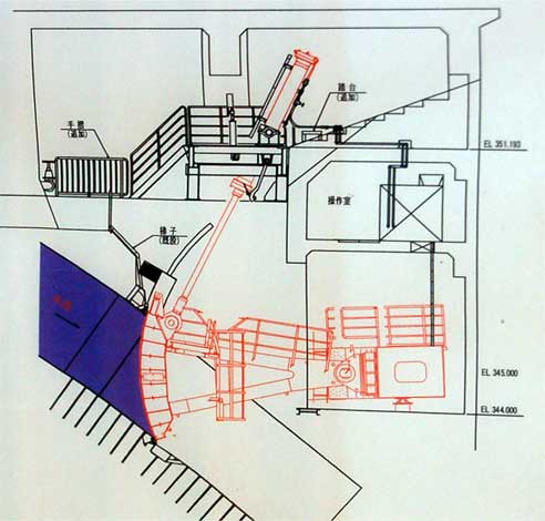 ゲートの扉についたシリンダーが一つ上のフロアに出ていて扉体を動かすタイプ。
