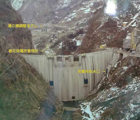 発電用取水口や下流の湯の瀬調整池ダムにその間にある発電所管理所と