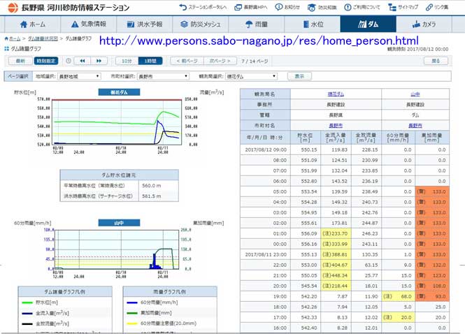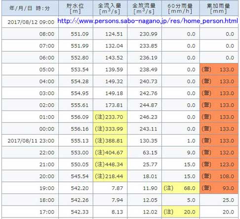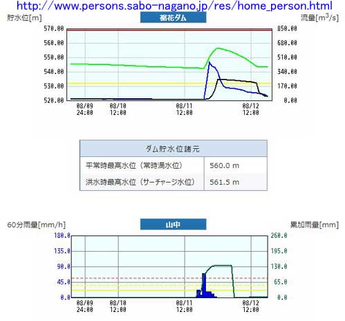 こちらは長野県 河川砂防情報ステーションで検索したこの豪雨時の裾花ダムのグラフです。