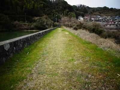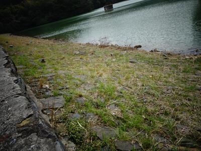 貯水池側の堤体上流面は石張りですがふわふわの背の低い草に覆われていました。
