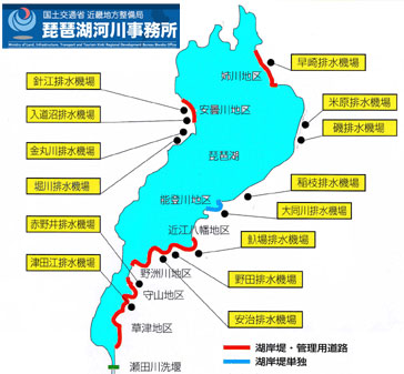 水資源開発公団(現:水資源機構)の琵琶湖開発事業による湖岸堤と排水機場整備がありました。