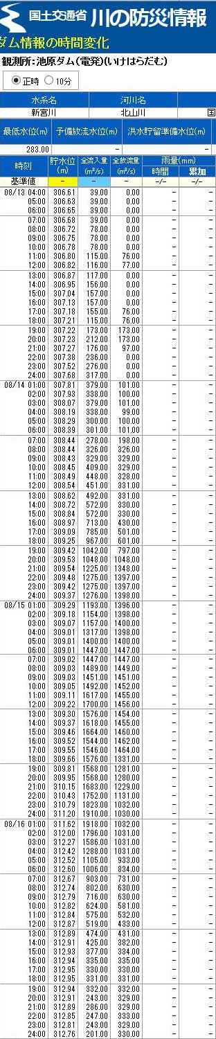 8月13日〜8月16日の貯水位、流入量、放流量。