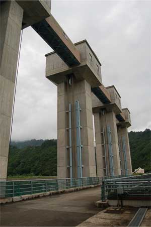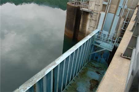 右岸の発電所公園から見ると物凄くでっかかった水色の扉体です。