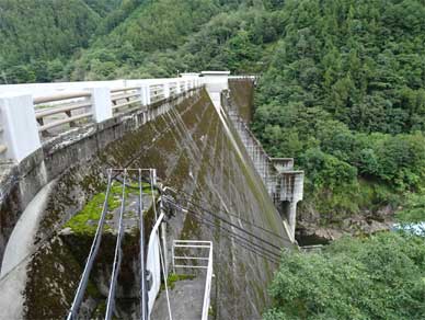 ここから見られる堤体、中空重力式ならではの急角度がたまらなく素敵♪