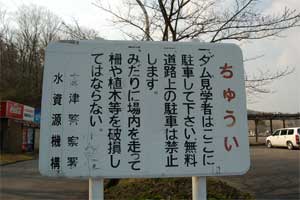 車で天端を渡ってそのまま進むとくるっとまわって管理所横の駐車場に到着します。