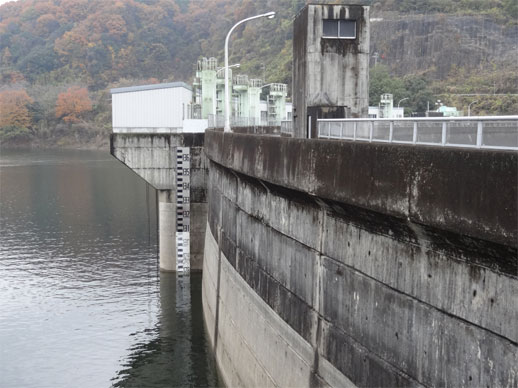 湖岸の裸地が見えている時よりは水位が回復して紅葉も美しい
