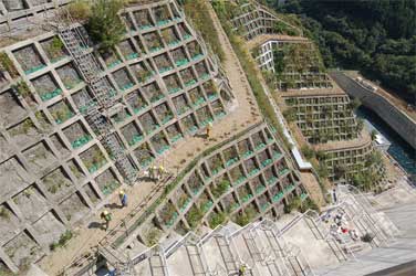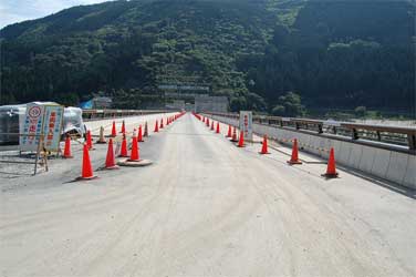 天端はまだ所々工事中でこんな風にバイロンが並べられていました。