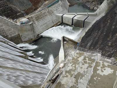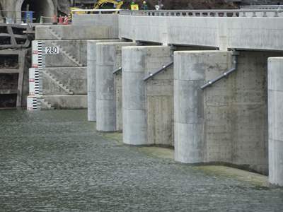 ゲートレスの低水位放流路と中水位放流路が併せて3門。
