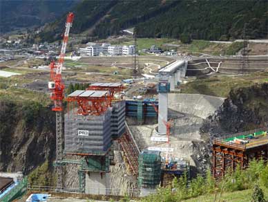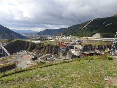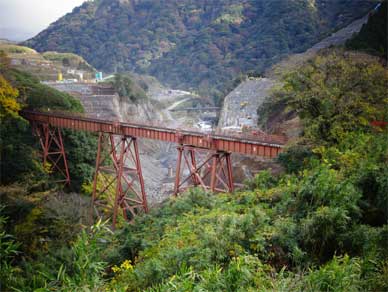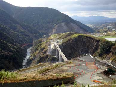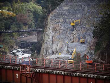 南阿蘇鉄道の立野橋梁の向こうで進む工事の様子。