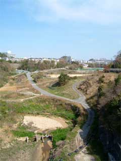 天端からずーっと上流側を見ると公園とその周囲の住宅街が見えます。