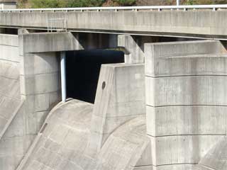 そして下流側には天端中央に2門の幅で堤体導流壁に囲まれた部分が。