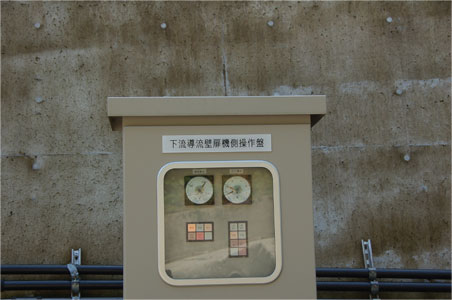 傍にあった操作盤には「下流導流壁扉機側操作盤」の文字が。