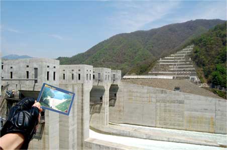 頂いたダムカードと一緒に撮りたいクレスト放流との2ショット。