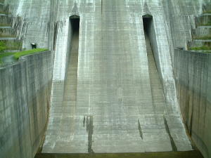 減勢工の上には橋がかかっていて堤体を正面から見る事ができます。