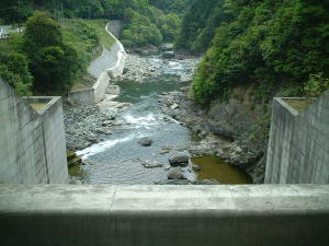 端から下流を見ました。貯水量に対して割と水が流れているように感じます。