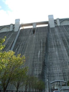 暮れかけた陽射しをバックにそびえる堤体です。