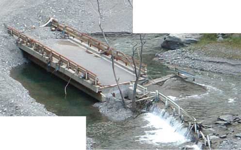 浸水して土砂に洗われて繋ぎ目が外れた橋。