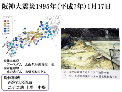 阪神大震災でのニテコ池と東日本大震災の藤沼ダムを上げました。