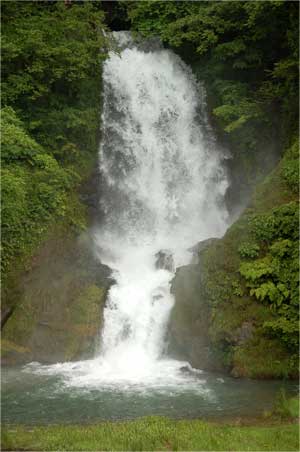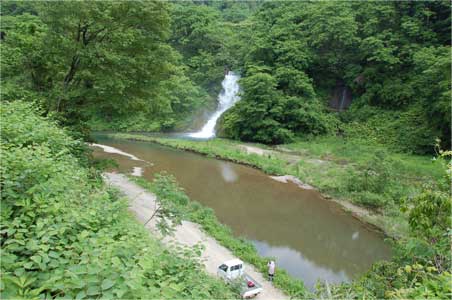 この滝は山の向こうの室牧ダムのダム湖から来ている水なのです。