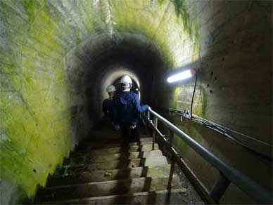転ばないようにひとつずつが大きな段の階段をゆっくり下りていきます。