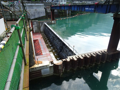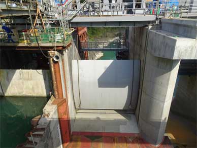 写真の左に写っている2号ゲートの扉体は隣の1号ゲートと一緒に