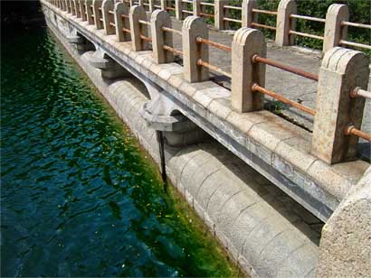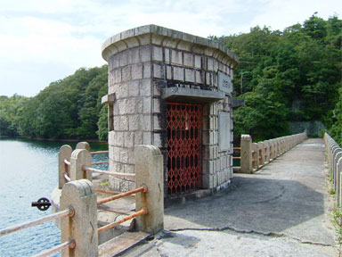 ダム湖に出た形の取水塔から天端左岸側の下を覗き込むと
