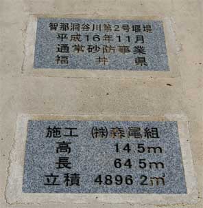 この砂防ダムの名前は智奈洞谷川第2号堰堤というようです。
