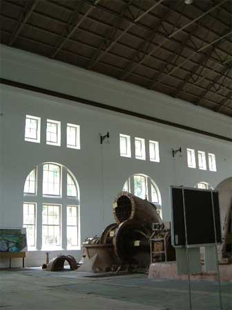 武骨な水車のケーシングと発電機を覆う繊細な建屋。