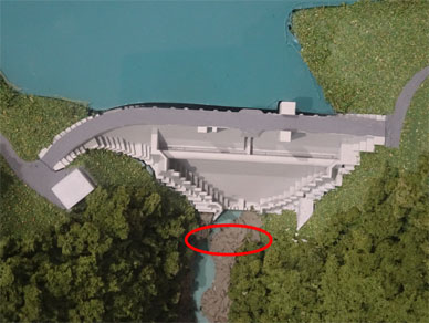 水理模型実験を行って、洪水吐からの放流水をダムの中位標高において