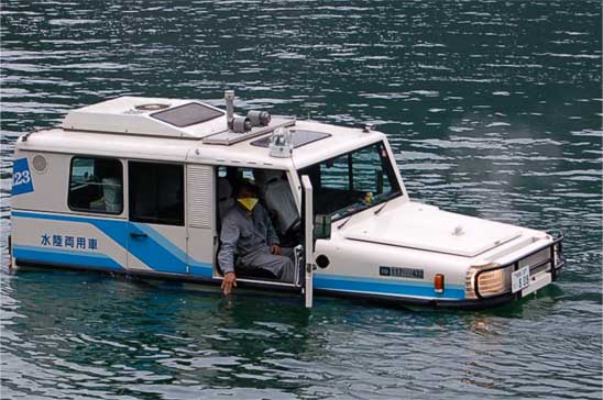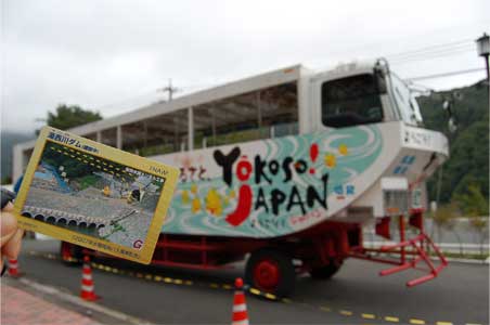 ダム湖をゆっくり回る水陸両用バス。