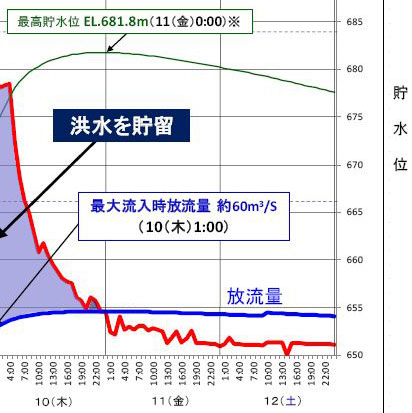 流入量を示す赤線と放流量を示す青線が交わったところが