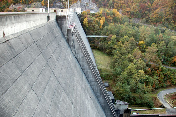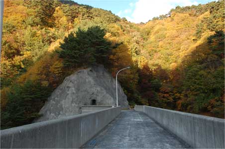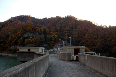 洪水調節でいつも頑張る常用洪水吐のゲートは堤体の中。