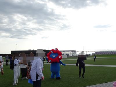 何かの気配を感じて起き上がるとアリーナにミャクミャクが来ていました。
