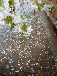 早くから咲き始めた桜の下には雨で散った花びらが。