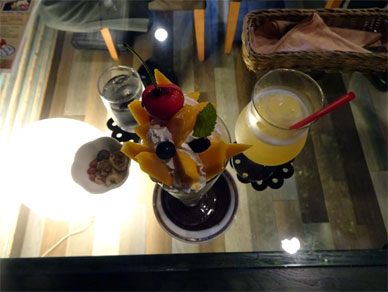 場違いかとそわそわしましたがマンゴーパフェにプラムのカクテルと